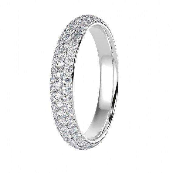 This beautiful band features pave diamonds covering three sides of the band and flow around the band in an eternity style.Bombe comfort fit eternity band with 3 rows of F/VS pave diamonds. Total diamond weight 1.50 cts. These setting gives beautiful look to diamonds